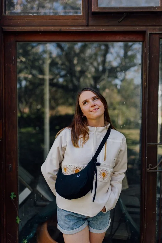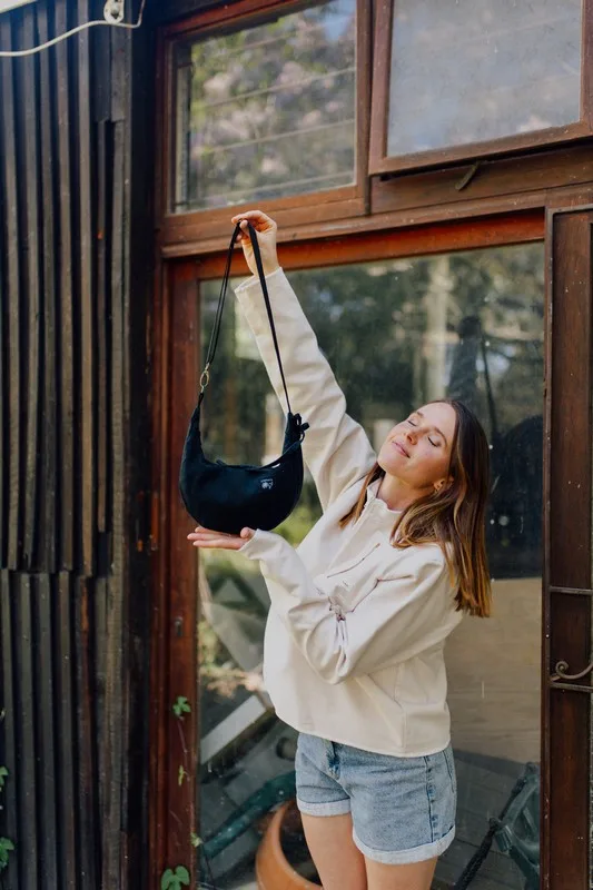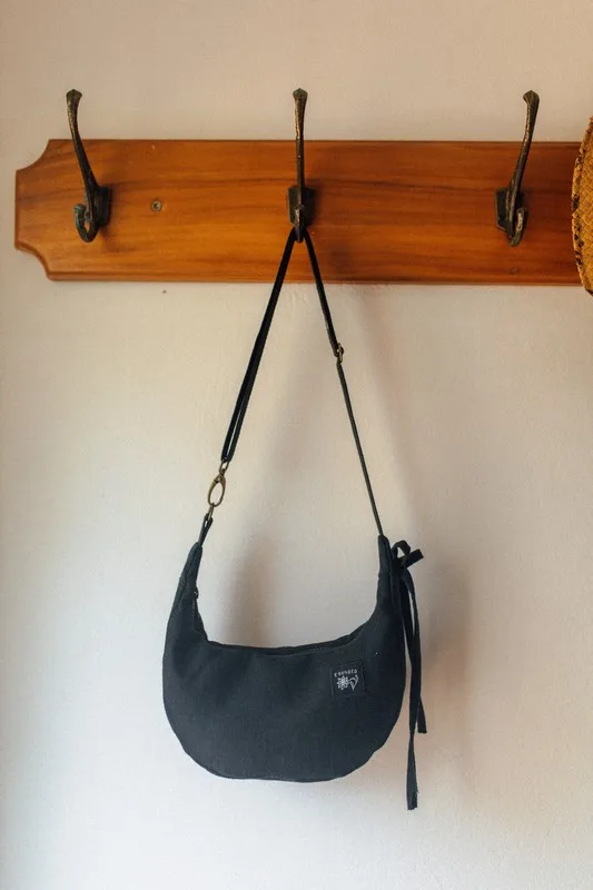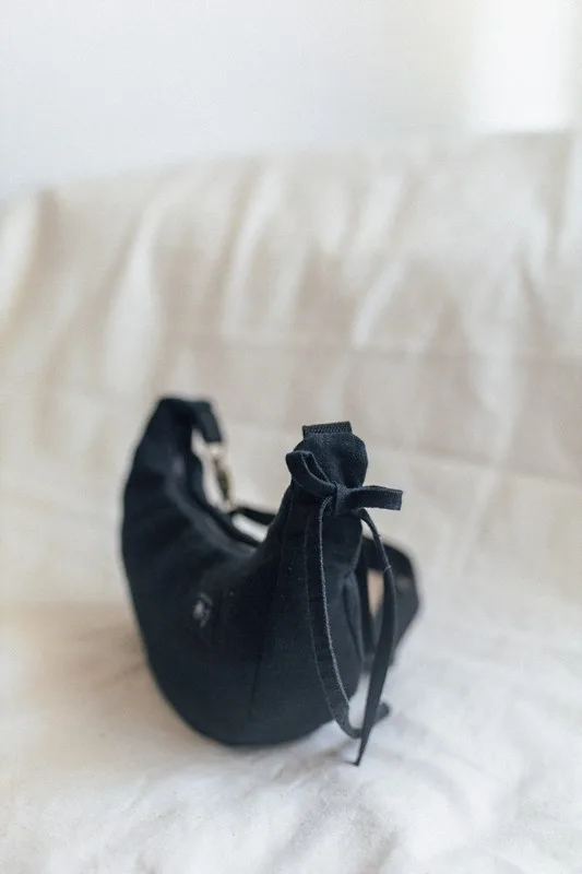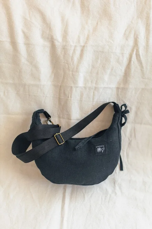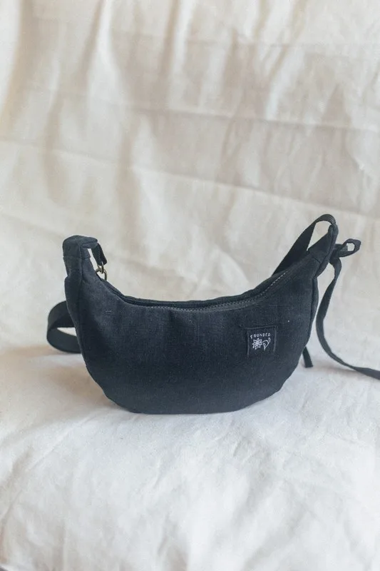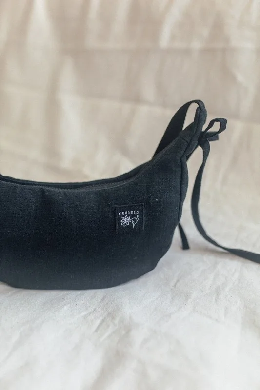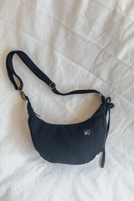 This moonbag is made from reclaimed black linen fabric. It has a nylon strap and metal clasps. Inside is a extra pocket. Label is painted by hand.
