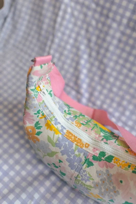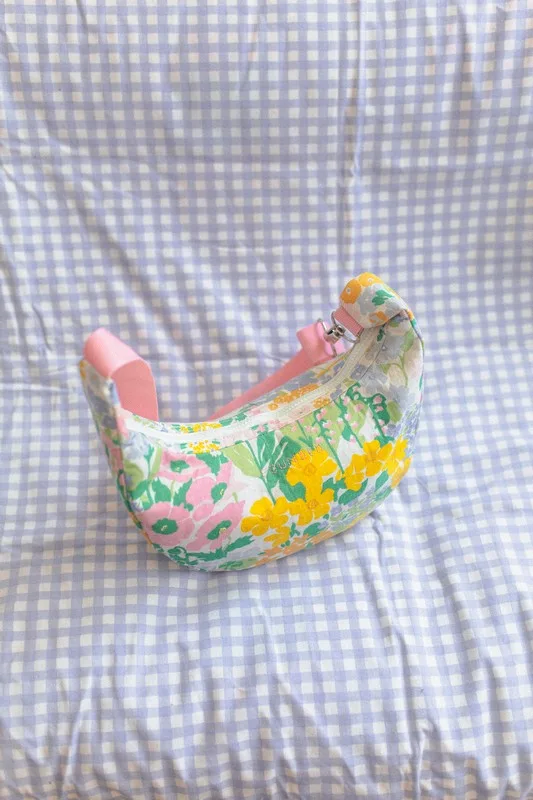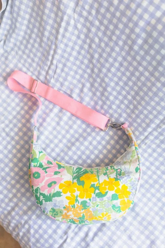 This crescent moonbag is made from a reclaimed laundry bag. It is 100% cotton. It comes with a pocket in the inside. The strap is nylon with metal clasp. Has hand embroidery on the front.